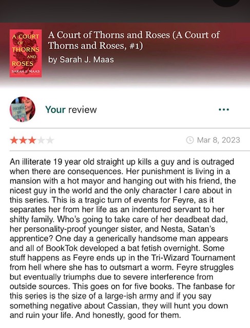 I saw this “review” of the ACOTAR series and it made me laugh out loud. It’s actually pretty accurate!